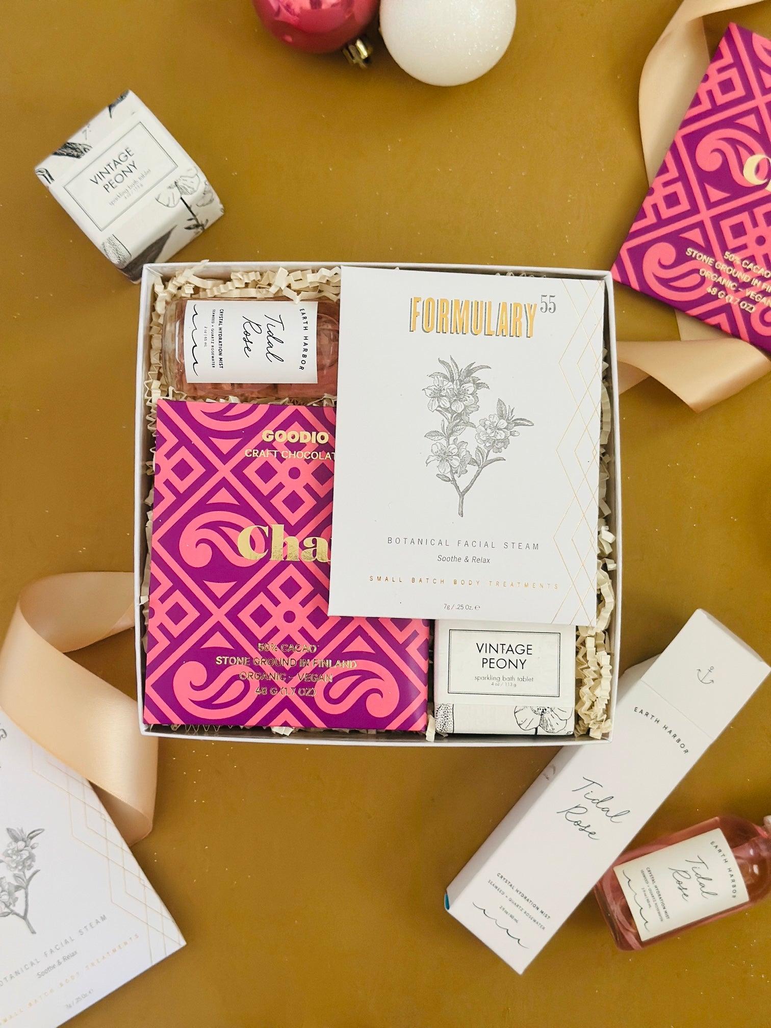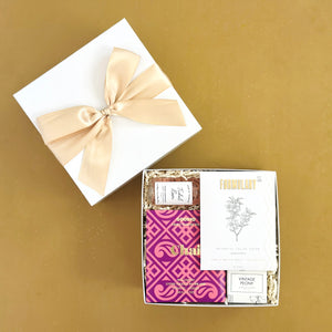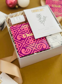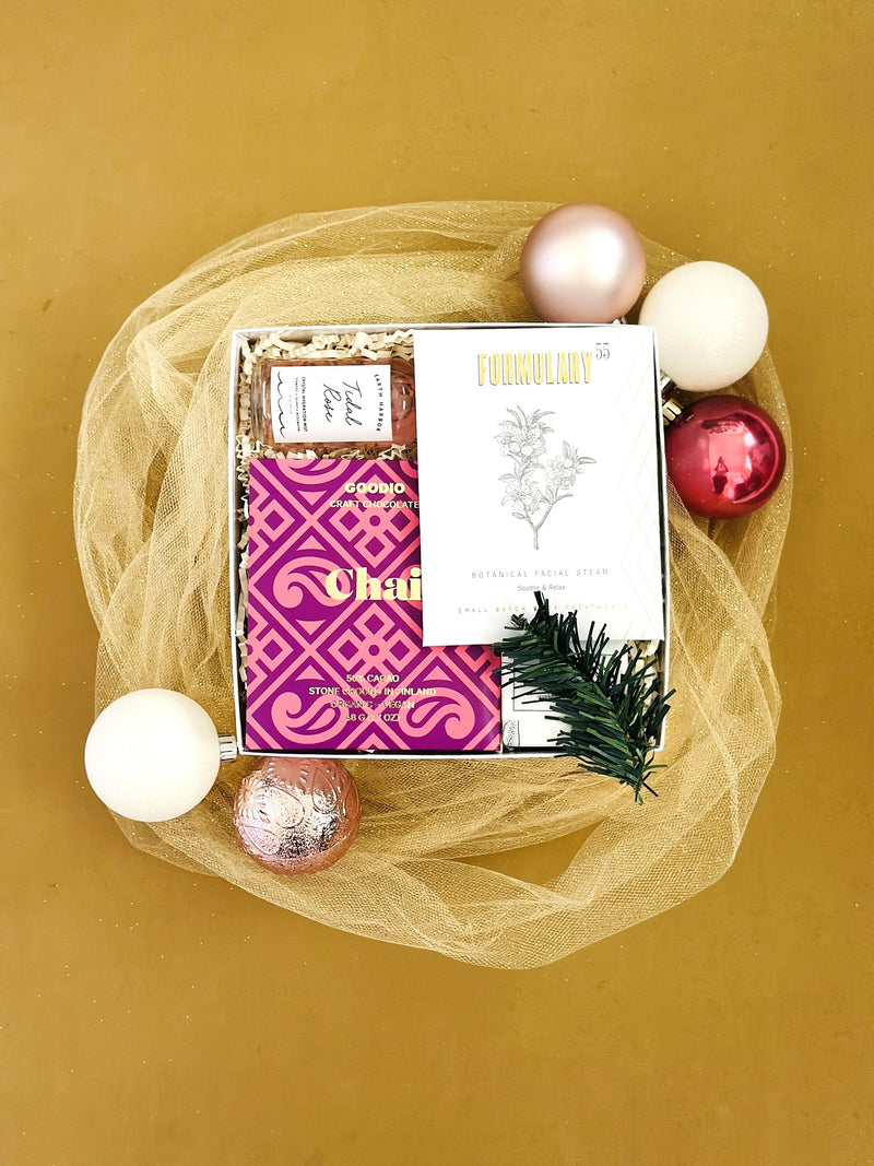 Indulge her with the perfect holiday treat: a beautifully curated gift box filled with sweet delights and luxurious self-care essentials. This box includes a decadent chocolate bar, a botanical facial steam, a soothing bath tablet, and a calming rose bath soap—everything she needs for a cozy, pampering escape. Ideal for celebrating the season with a touch of warmth and relaxation.