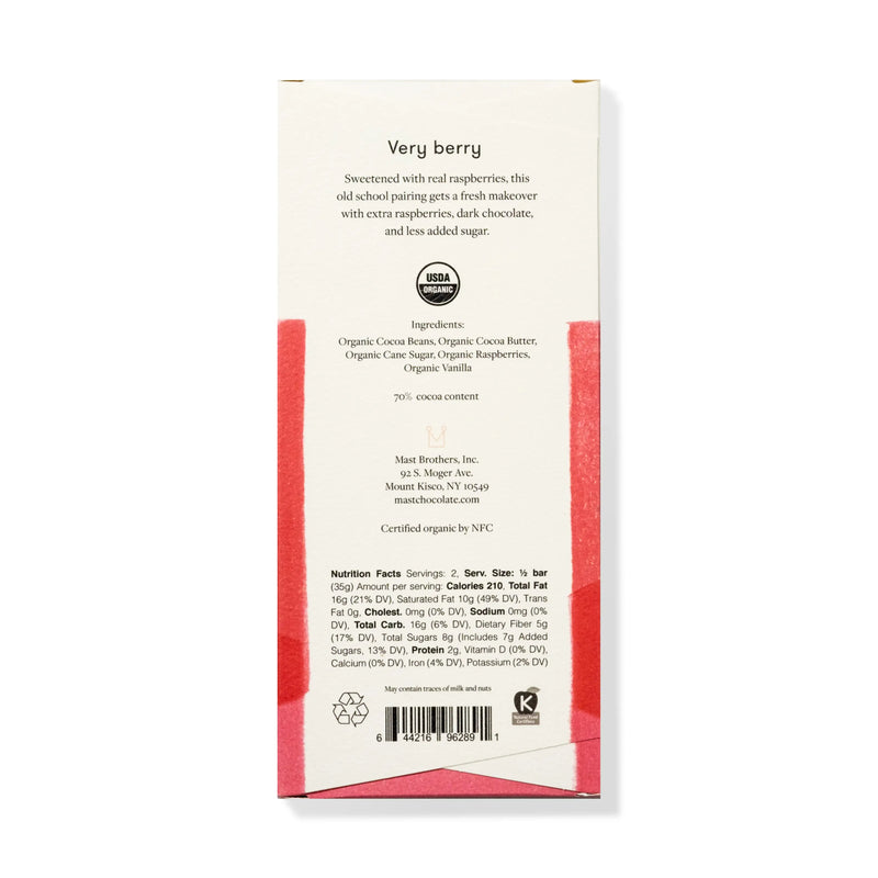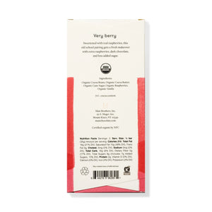 Ingredients: Organic Cocoa Beans, Organic Cocoa Butter, Organic Cane Sugar, Organic Raspberries, Organic Vanilla