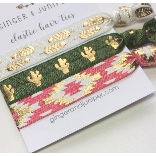 Hair Ties set - Feathers, Cacti on green, Pink Aztec