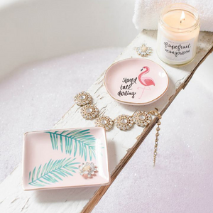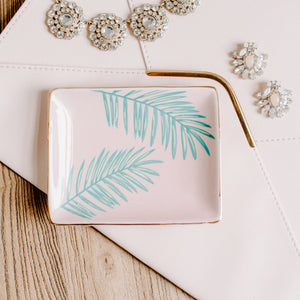 Our chic Palms Tropical Jewelry Dish adds the perfect touch to your dresser, desk, or night stand. This stylish trinket tray is perfect for placing your wedding ring or earrings in to keep them in a safe place. The hand drawn palm design and gold foil rim on the tray adds a touch of chic glam for your jewelry, keys, office supplies, and more!