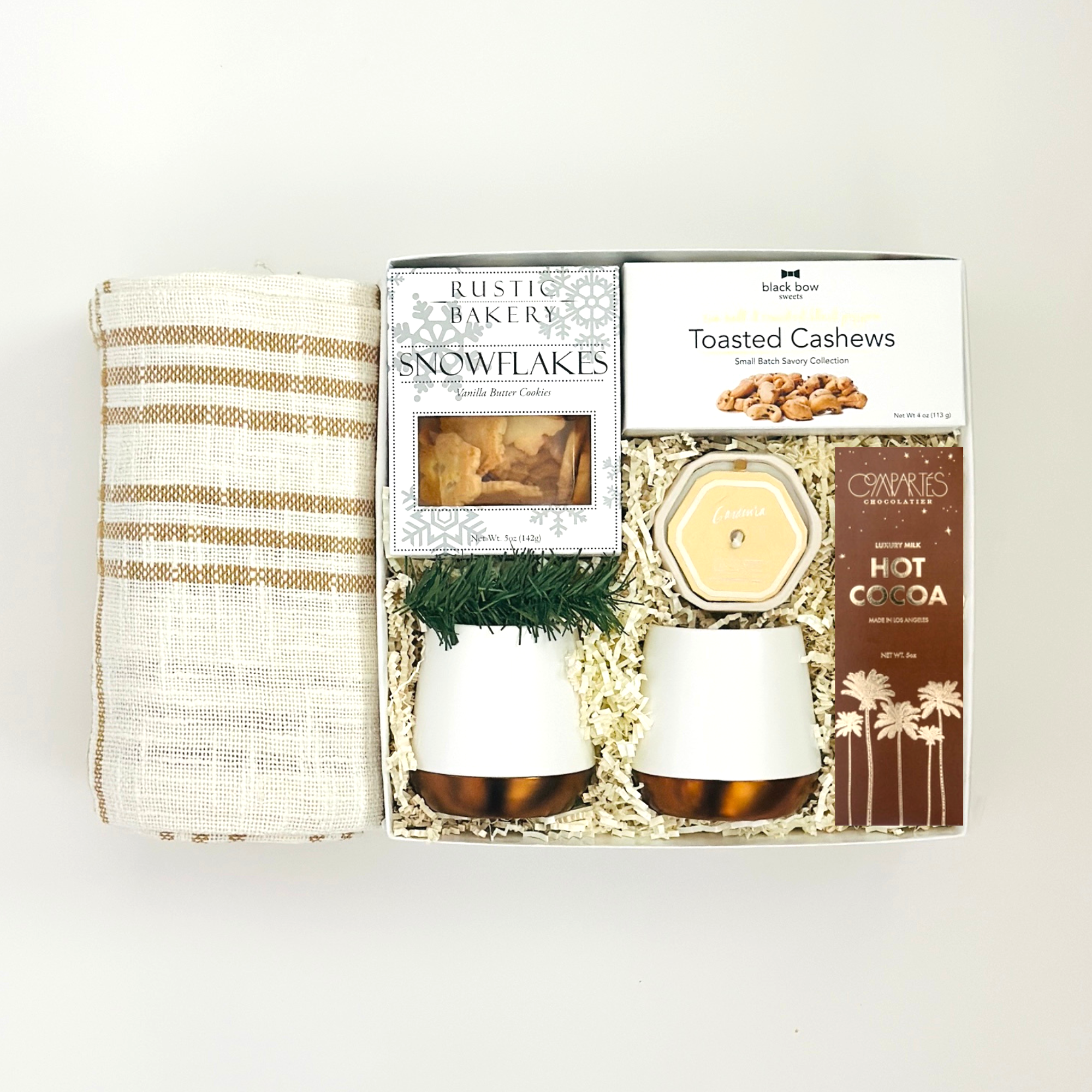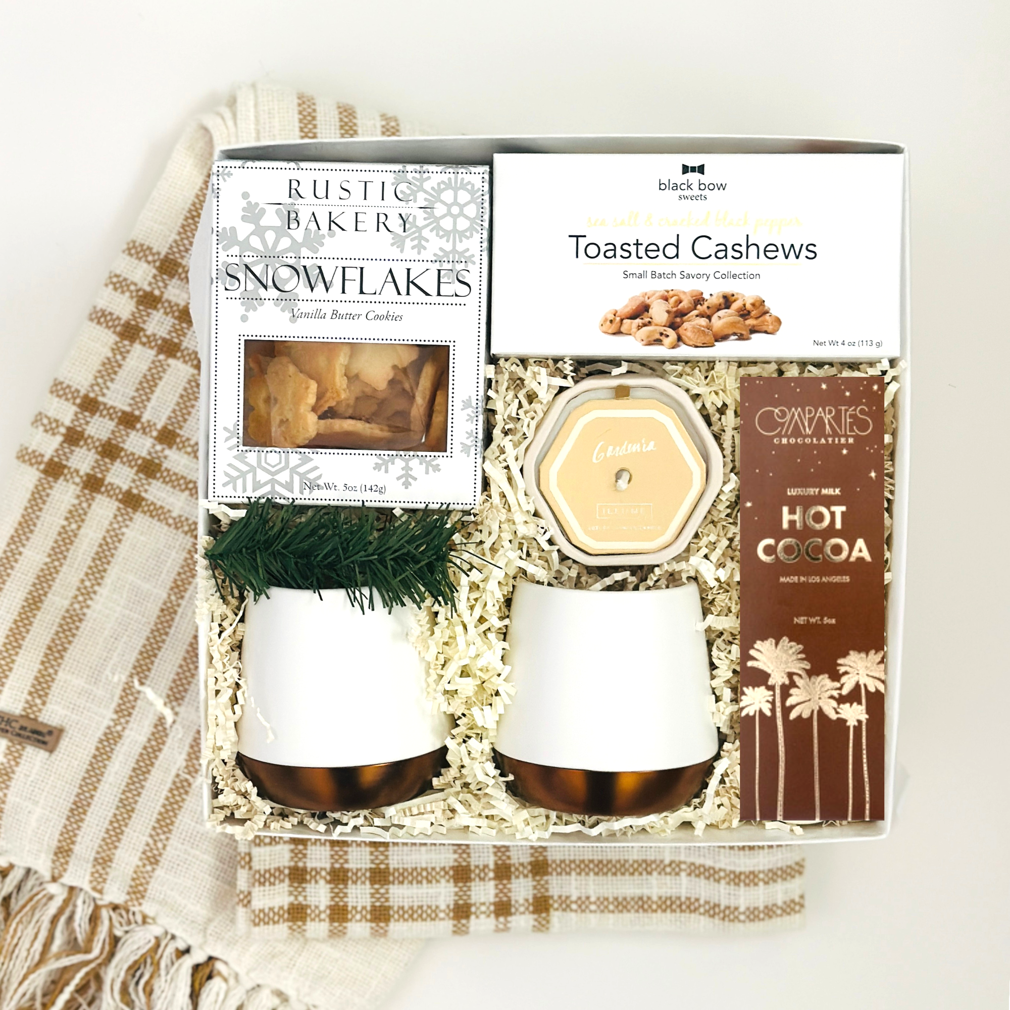 Indulge in the Cabin Retreat gift box, a sophisticated gift perfect for anyone who appreciates the finer things. This luxurious selection includes artisanal snowflake cookies, premium toasted cashews, creamy hot cocoa, a beautifully scented candle, two chic tumblers, and a beautiful woven throw. Each high-end item is chosen to create a warm and memorable holiday experience, making this gift box a standout for the season. This gift box is one of our top picks from this years holiday collection.