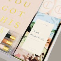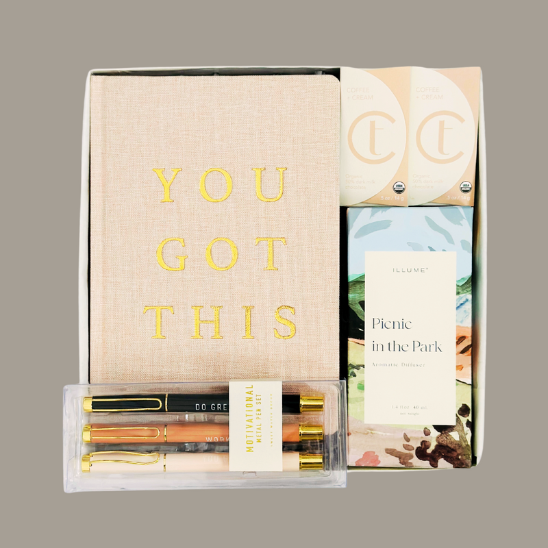 Inside, you'll find our 'You Got This' journal, the perfect companion for capturing thoughts, dreams, and aspirations. Accompanying the journal are three motivational pens, each adorned with uplifting quotes to ignite creativity and drive. To set the scene for relaxation and reflection, we've included a 'Picnic in Park' reed diffuser to immerse in the soothing scents of a sunlit afternoon and a decadent chocolate bar.