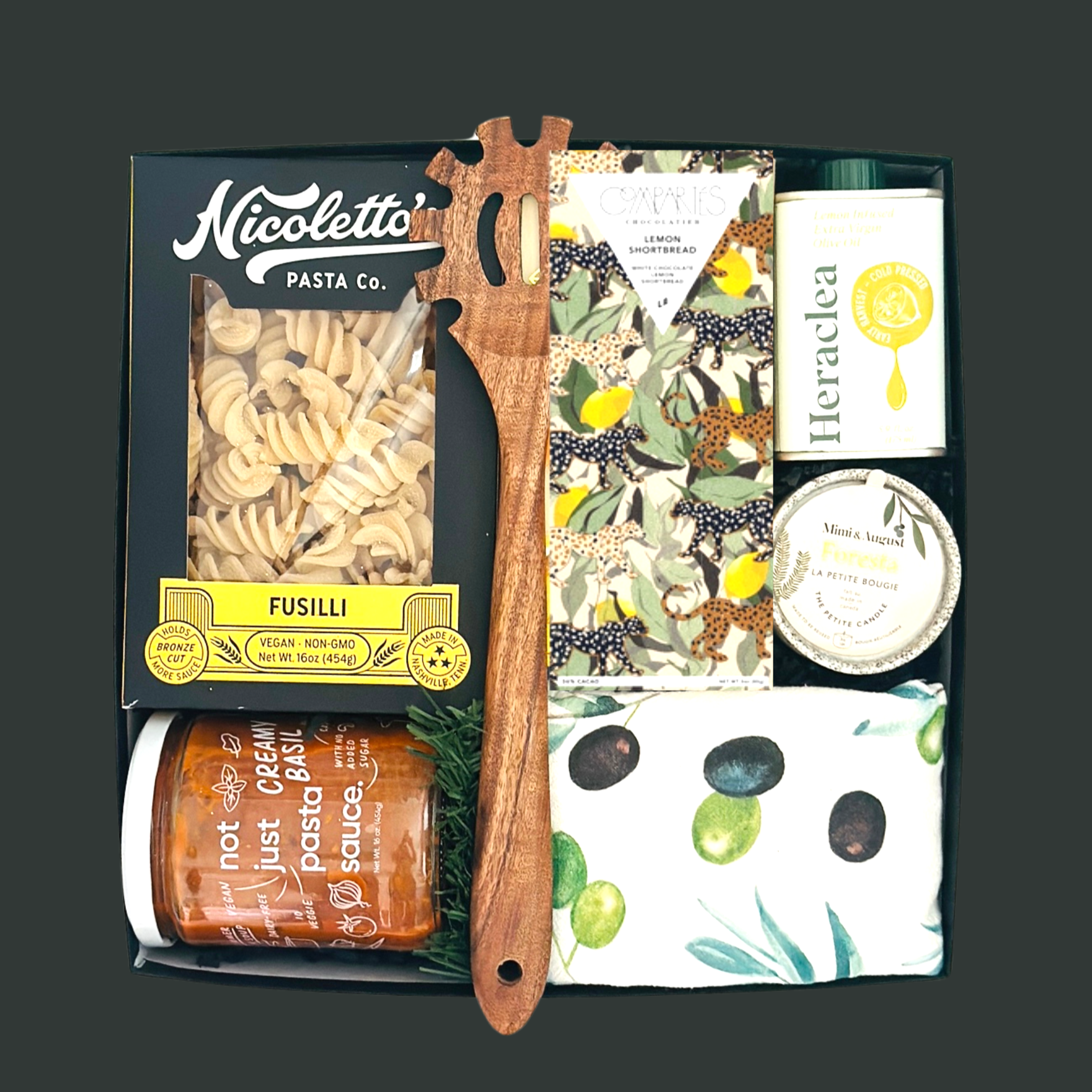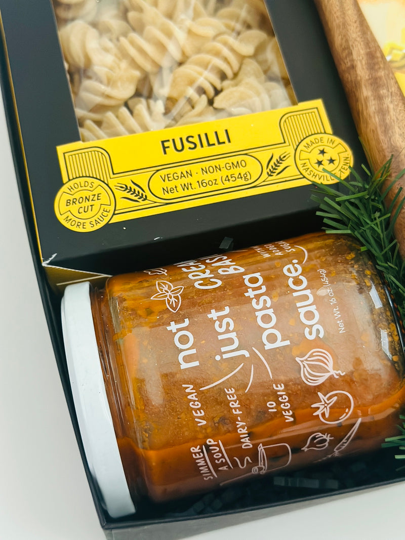 Perfect for the holiday hostess, clients, or any pasta lover, our "Pasta Night In" gift box offers a delightful escape to Italian flavors and festive comfort. Featuring gourmet pasta, rich sauce, and premium olive oil, along with an elegant pasta spoon and olive print tea towel, this box brings a warm, memorable experience to any cozy night in. Top it off with a holiday candle and a decadent chocolate bar for a truly indulgent evening. Treat your loved ones or clients to an unforgettable gift that blends luxury with the charm of a homemade Italian meal!